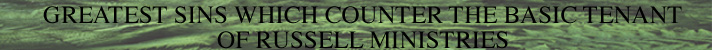 |  | |  | | 1. That for the human species to survive, humans must unite and develop a unified respect for all species. 2. That all faiths and religions must join forces with the non-religious to commit to a few unalterable moral principles and guidelines for the conduct of their lives. 3. That these principles are based upon an expanded understanding of the golden rule which encompasses all life in the universe, or all creation. 4. That the golden rule of the new millennium must be a part of every action and decision made in any capacity, whether in business or in personal endeavors. 5. That there are noble principles in all of the world religions both great and small and that these shared principles can form a bond of unity to create a "peaceable kingdom" for all of the earth's inhabitants. 6. That humans recognize that the concepts of "eden," "Shangri-la," and other ideals of paradise on earth have validity based upon fecund ecosystems which supported an abundance of and diversity of life before being destroyed by overpopulation and over-exploitation by humans. 7. That we humans reside on "Planet Eden" and that the "Forbidden Fruit" of the tree of knowledge was the capacity of humans to develop technologies which allowed the destruction of Eden. 8. That we are destroying the isolated remnants of Eden at a rate which will ultimately destroy the human species if left to the devices of insensitivity and greed. 9. That God's gift of dominance over other creatures was and is not a license to exploit and destroy; it is instead the capacity that our intellectual gifts allow us to dominate the earth and that we must direct that capacity toward stewardship and protection of all life forms. 10. That God's directive to "be fruitful and multiply" was not a directive to overpopulate Planet Eden to the detriment of the quality of life of all life forms including humans; that we have been fruitful and over-multiplied and now it is time to reach an equilibrium with our fellow travelers on Planet Eden. 11. That God's directive to Noah to save every species is perhaps the most important directive in the Judeo-Christian tradition and the one which especially must not be ignored today. 12. That greed, hypocrisy, cruelty, gene-o-cide and other human frailties must be replaced with generosity, honesty, kindness and stewardship or we and future generations are doomed to scramble for survival on a dying planet which will become a living hell. | | | |  | | The Russell Ministries are a confederation of churches, individuals, religions, or faiths which are willing to commit to the protection and preservation of God's creation and which commits to adopting the expanded Golden Rule of the New Millennium. No one has to abandon their principles, faith or church membership. Anyone can join as long as they commit their lives to the one governing moral principle of protecting Planet Eden through application of the Golden Rule. Christians, Jews, Hindus, Moslems, Buddhists, Animists, Agnostics, and even Atheists are invited to join. The primary means of communication will be the world wide web or internet which allows persons in any part of the world to participate in working toward our common goals. Respect for individual freedom of expression and freedom of choice is paramount as each human must find his or her own meaning of God or universal force representing God. Each person must be free to choose their own code of ethics as long as the central guiding principle of Russell Ministries is followed. Life, Liberty, and the pursuit of happiness, should be considered a governing principle of the new Golden Rule and should be applied to the treatment of all creation to the extent allowed by the laws of nature. If you would like to help in our mission of bringing peace to the world, please join us by becoming a member. If you would like to help our mission financially, we would be most appreciative. Even one cent or a "Widow's Mite" if united with other pennies, nickels, or dimes will help further our mission and spread the word throughout the world. | | | | | | | 1. LOVE: We should attempt to not only "love thy neighbor" but love all creation as the work of God. 2. GENEROSITY: We should, when blessed with more than our basic requirements for a quality standard of life, use our surplus resources including time to restore Planet Eden, bring comfort to the sick and dying, form common bonds with others, help the helpless and less fortunate, and continue the work of Noah by protecting the earth. 3. KINDNESS: We should strive to be kind to all creatures great and small. 4. PEACE: We should work toward achieving common goals through the application of love, generosity, and kindness to establish world peace | | | | | | | 1. GREED: Greed is perhaps the most dangerous sin. Greed is causing the plunder of Planet Eden, the exploitation of God's creation and the unsustainable conversion of the Earth's resources into commodities. 2. IGNORANCE: Ignorance allows unknowing people to be manipulated by Greed. Ignorance allows millions of unwanted conceptions to occur resulting in abortions, neglect of children, hunger, and countless unnecessary births resulting in unnecessary suffering. Ignorance allows the uneducated to destroy the thousands of species of life without even realizing the harm they are doing to the planet and the quality of life for future generations of humans and other species. 3. CRUELTY: Cruelty and lack of empathy allows millions of the earth's citizens which includes all species of life to be exploited, tortured, maimed, killed, and enslaved unnecessarily. Cruelty is the very antithesis of the Golden Rule. 4. HYPOCRISY: Hypocrisy is a dangerous form of moral corruption resulting in, for example, Christians clamoring for executions and Christians carrying out executions, in direct contradiction of the Ten Commandments and the teachings of Jesus. | | | |